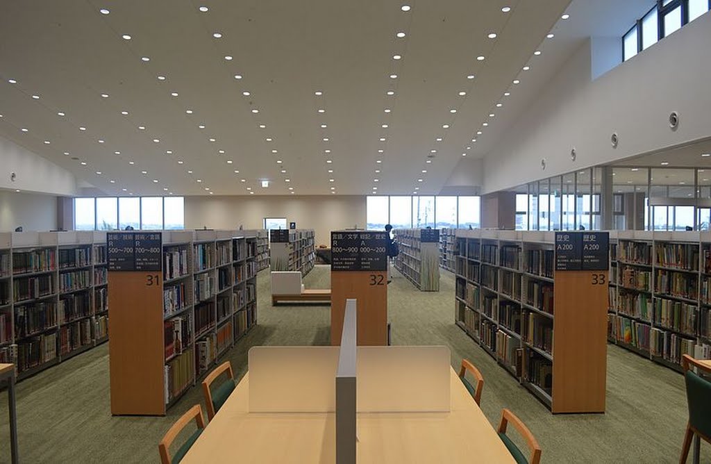 一言コメント:所蔵可能冊数では知多半島最大の図書館。天井が高いが書架は低く開放感がある。