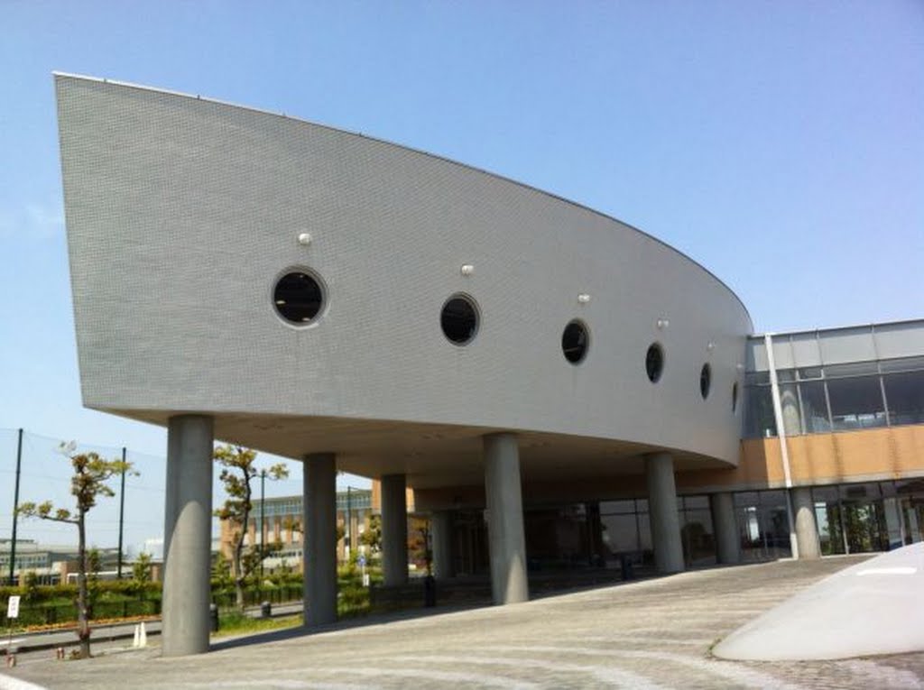 一言コメント:写真左の上部分が図書館。右奥は室内プール。手前の庭には大きなクジラの胴体と尻尾という変ったデザインの建物。カードは地元のみ(7月より海部地区まで拡充)。駐車スペース大。