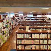 一言コメント:木製書棚、初夏。テーブルも木製で全体的に茶色。全集や文庫、新書が豊富。ゆったりした配置で、斜面を利用した作りになっている。蔵書が多く、圧巻。