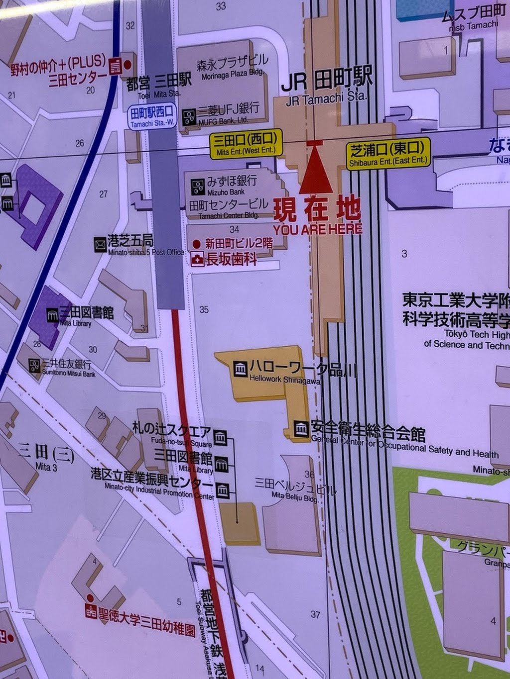 一言コメント:展示は「人工衛星と地球観測」「はたらく人のメンタルヘルス」「癒しの音楽」「高校野球定番応援曲」。隣の赤いビルは住友不動産三田ツインビル西館。