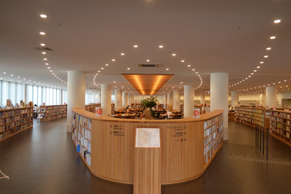 一言コメント:2014年開館。越後杉を使った書架やルーバー、暖色系の照明、低い書架に丸い柱の組み合わせなど、館内の雰囲気は最高。