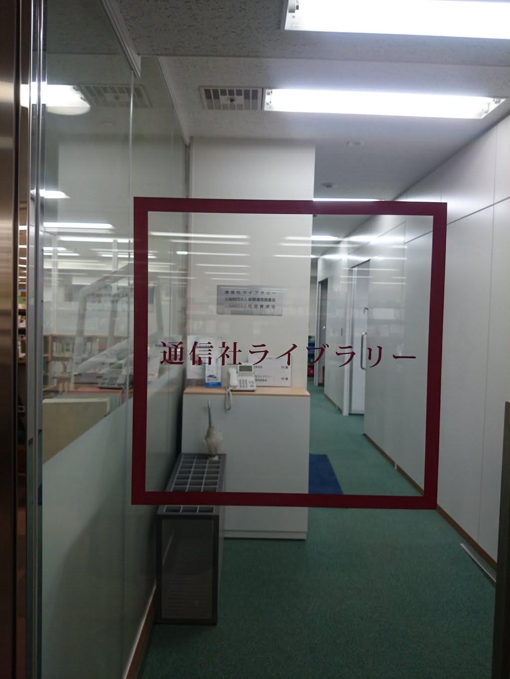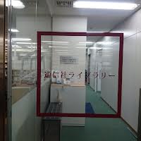 一言コメント:通信社関連書籍や総記ジャーナリズム、歴史、社会科学の本が開架で並ぶ。展示は「通信社の歴史」