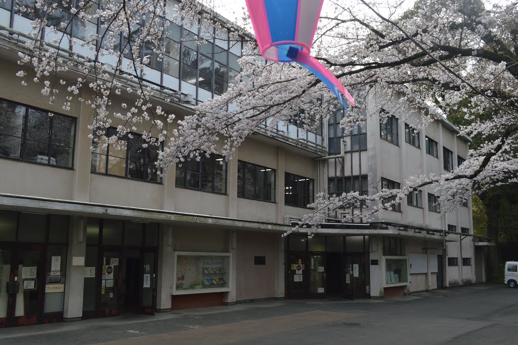 1969年の開館時からあって印象的だった図書館前の桜は、2018年9月の台風で亀裂が入ったことで伐採された。