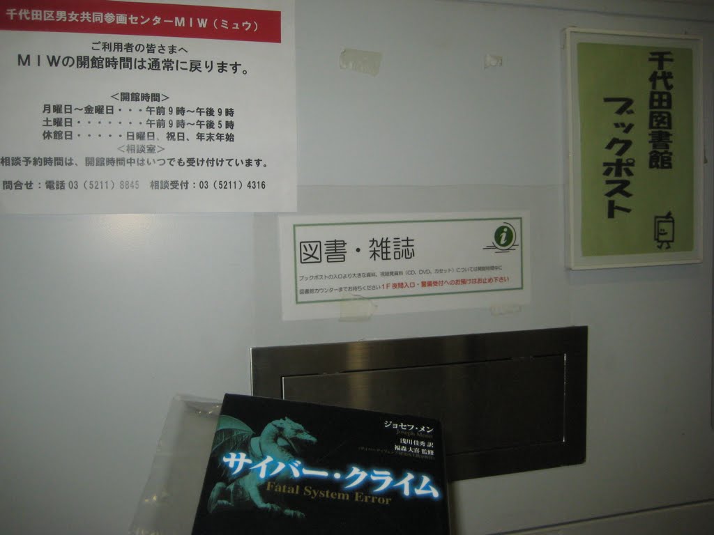 2012/03/24夜間来館 相互貸借本ポスト返却禁のため、麹町郵便局より、レターパックで返却発送しました。他は夜間ポストで