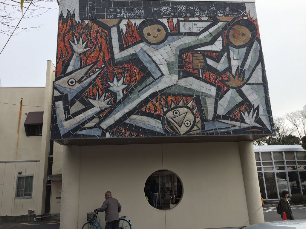 1970年竣工、北川民次による外壁の壁画、室内の陶板画がすてき。かつての書庫を開架スペースにリノベーションされていて、低い天井の空間も居心地がよい!