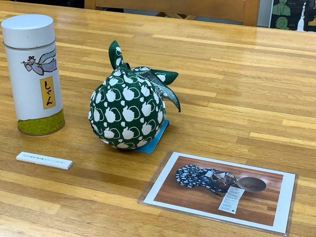 写真は和田誠記念文庫うおがし銘菓の風呂敷パッケージ2015年~。展示は「大人のための児童文学」「人生100年時代始めよう健康戦略」「夏」「おばけ」