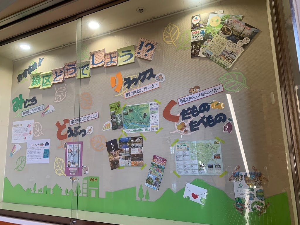 最寄駅は、相模原駅では無く「淵野辺駅」で各駅停車のみ停車。展示は「みんなで本を大切に 考えよう 図書館マナー」「折り紙でつくる ぐりとぐら」「スタッフおすすめの本」「今年は手作り 季節のお便り」