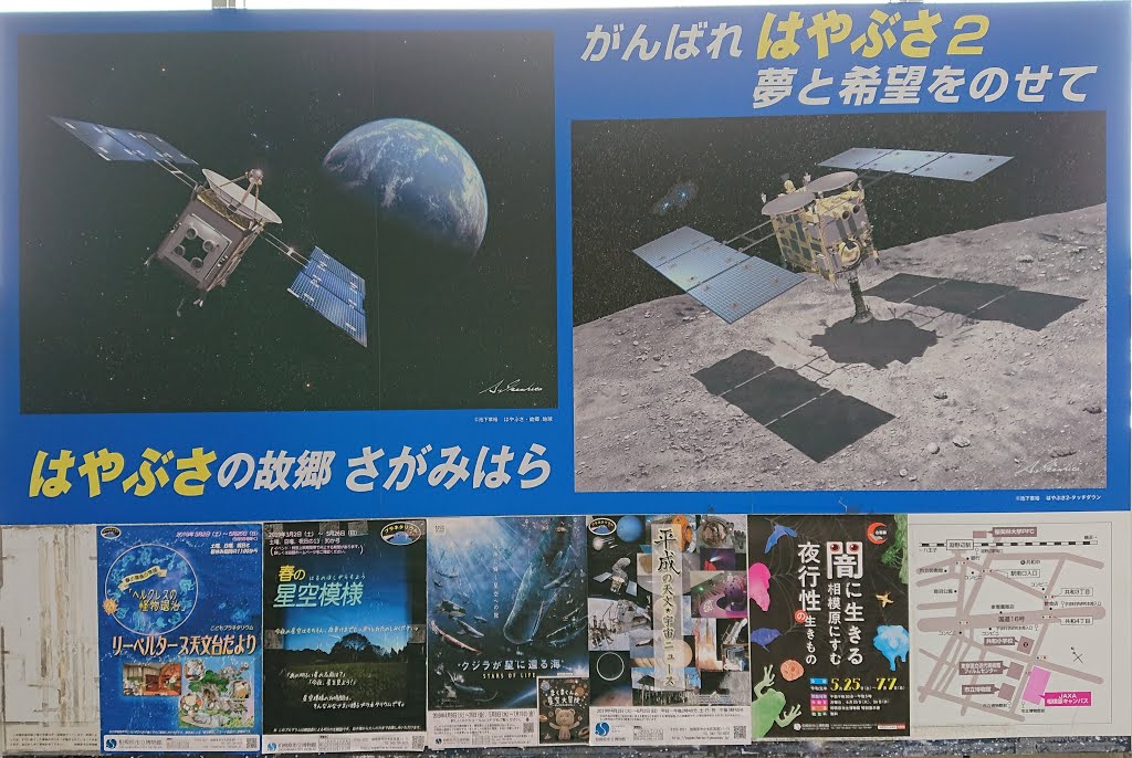 今日からシステムが変わり検索画面も更新。展示は「Reborn 新しいことにチャレンジしてみませんか?」「もっと知ってほしい 里親制度 のこと」。写真は最寄駅に掲示の近所のJAXA相模原キャンパスの案内