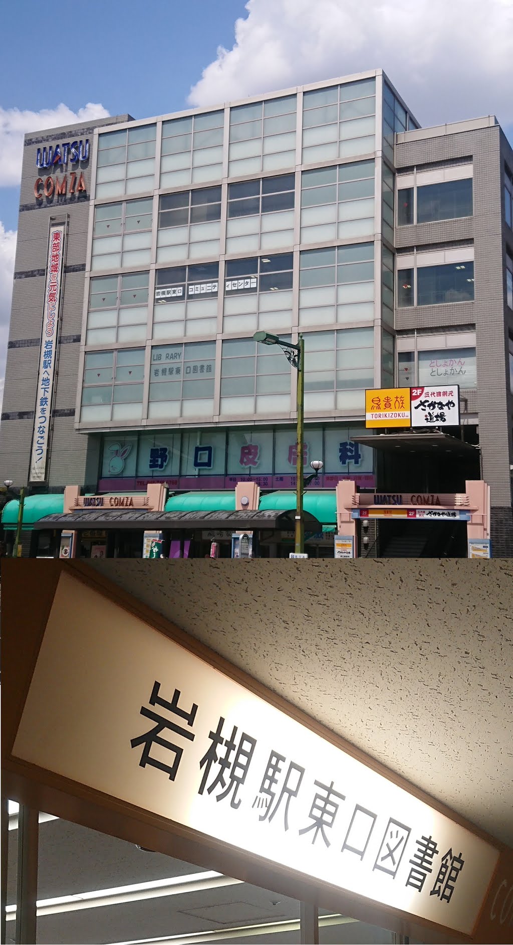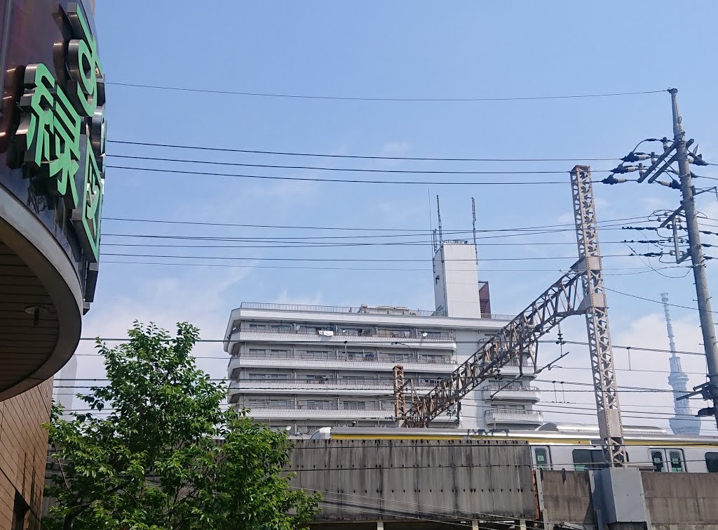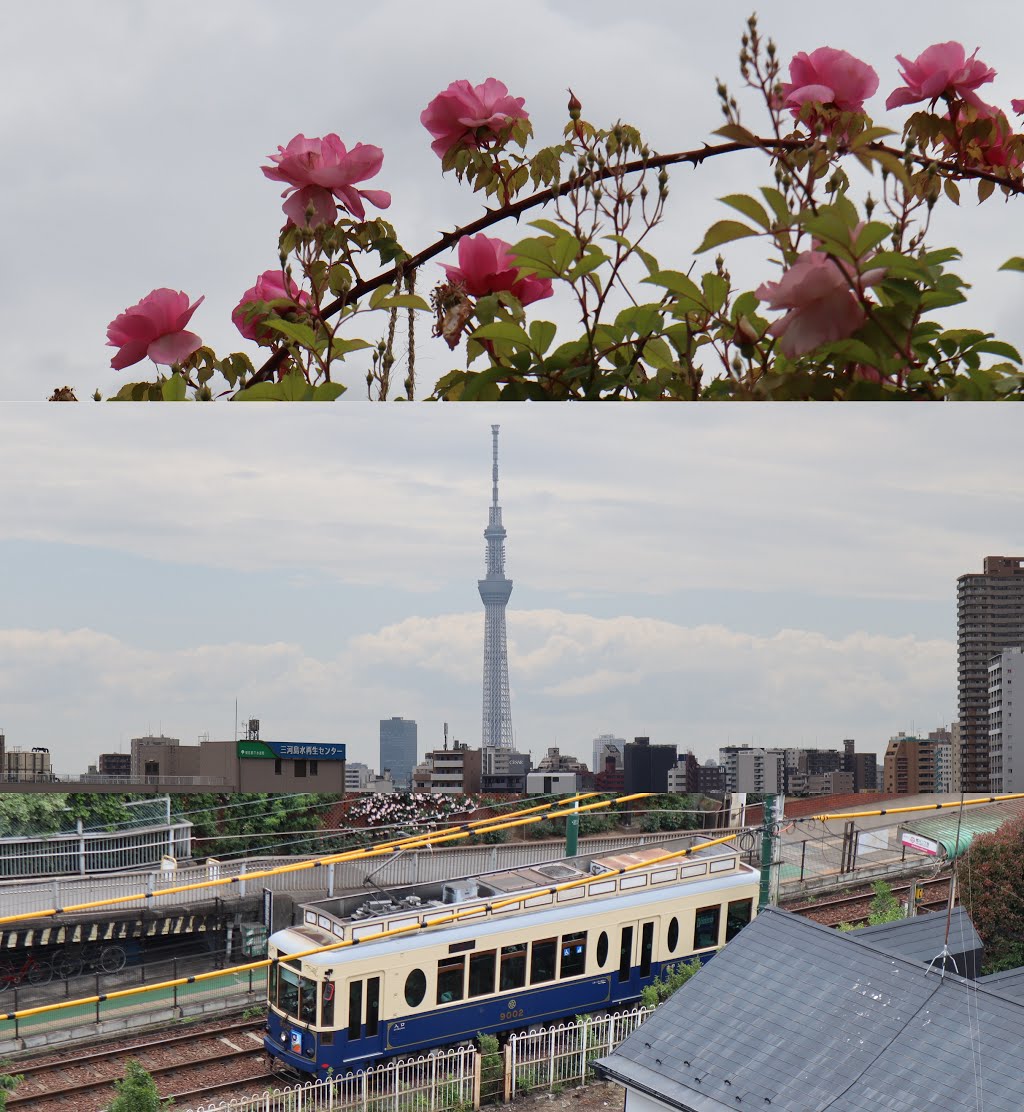 写真は緑図書館と総武線電車とスカイツリーと。展示は「五月TS特集気楽に古典」「すみだの歴史と地図」「美肌習慣を始めよう!」「新緑の季節」