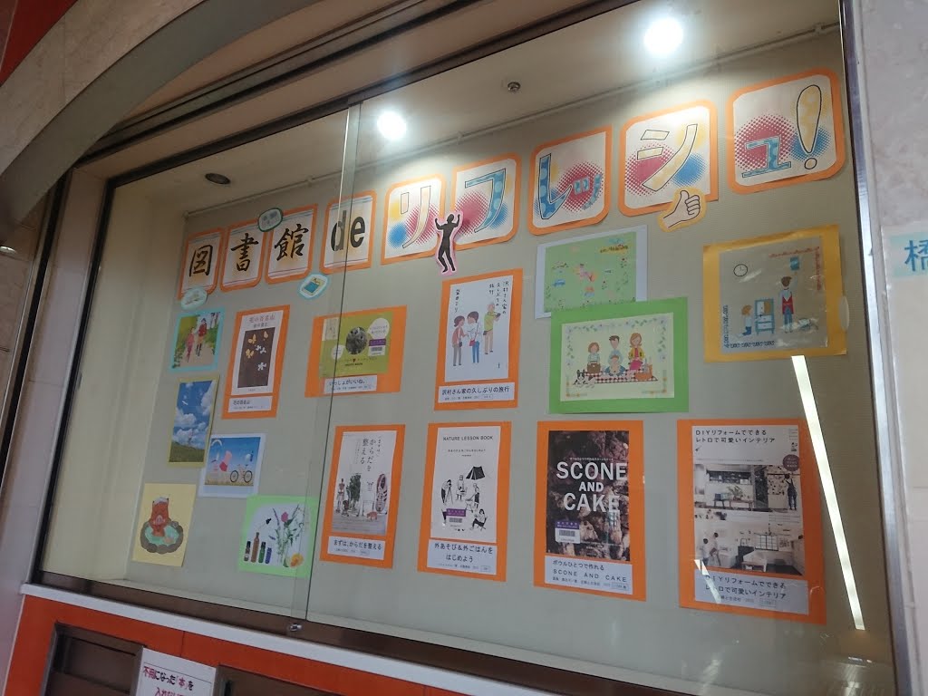 駅近便利。図書展示は「厳寒 暖かに暮らす」「家族」「そらをみあげよう!」「さむい冬こそ ぽかぽか読書」