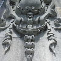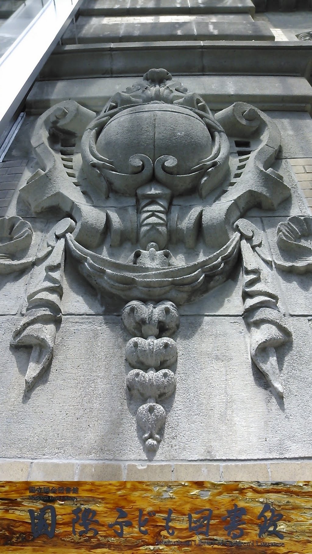 展示図書は「知の遺産 2011年 物故者を振り返る」 まあるい階段の外側壁面に掘り込まれた大きな文字と絵が気になります。