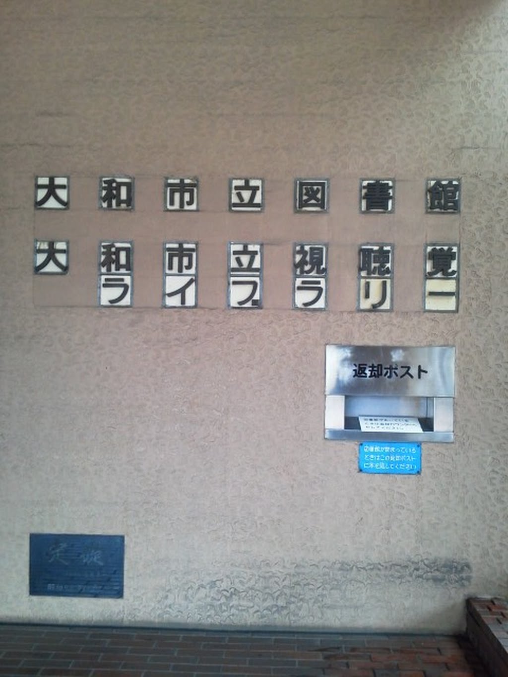 「目黒区立大橋図書館」の銘板、若干痛んでいて悲しいです。246号線から少し急な上り坂です。夏場気温35℃の昼下がり歩くとやっぱり暑いです。
