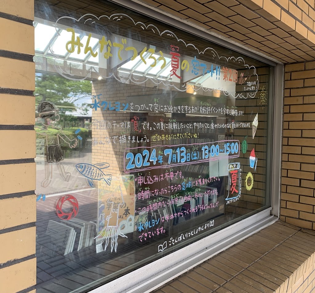展示は、作家の梁石日さんが6月29日に亡くなられました。季節の本。星。浮世絵と版画。夏休み宿題コーナー。図書館関連の写真が沢山。みんなでつくろう夏の窓アート。