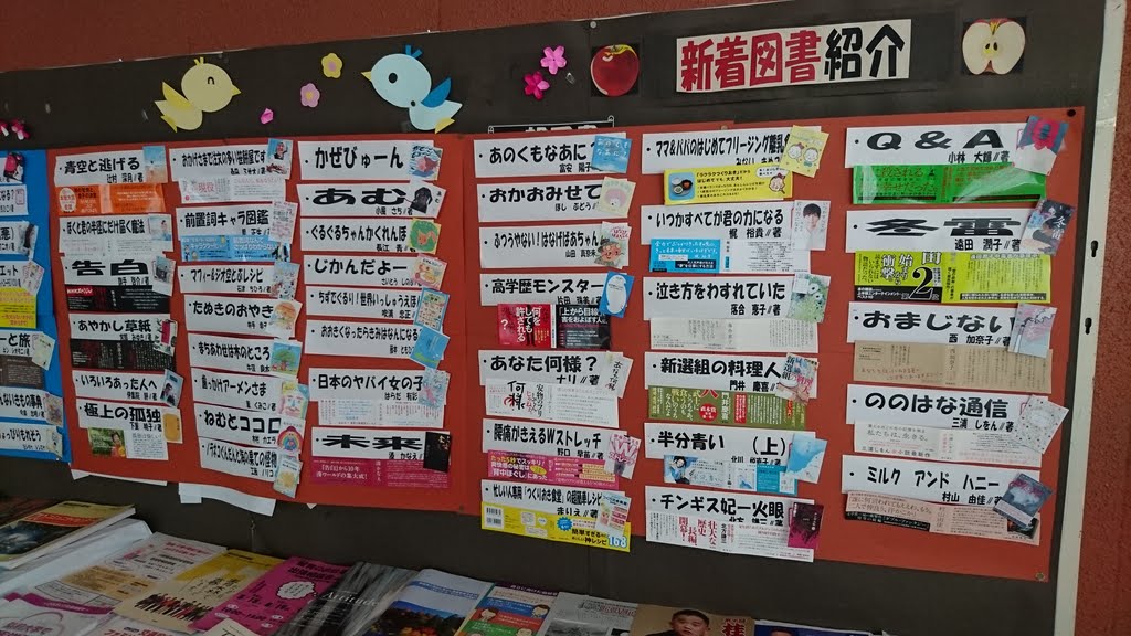 大きな公民館のような施設の2Fにある図書室。子ども用の図書室が別にある。廊下に本の帯をまとめてあり新刊を紹介している。